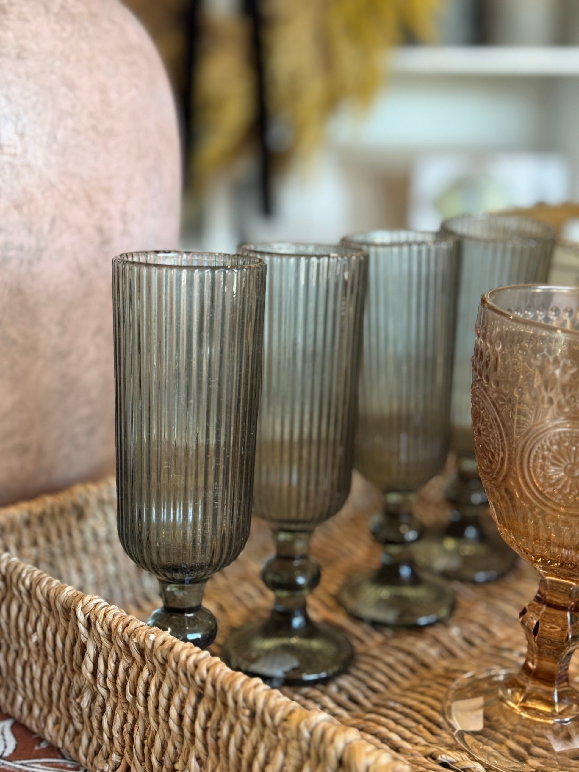 7” H Glass Striped Champagne Flute- Grey/ Green