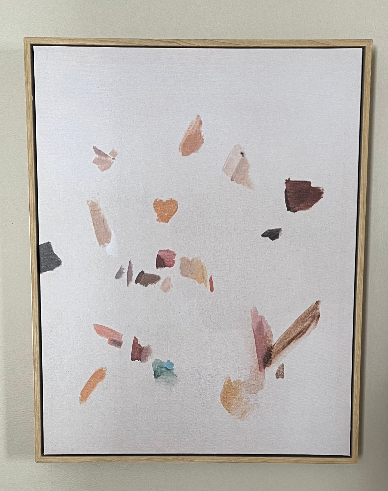 Framed canvas with abstract print on it. Great for little girl’s room or child’s bathroom. Size is 16” x 20”